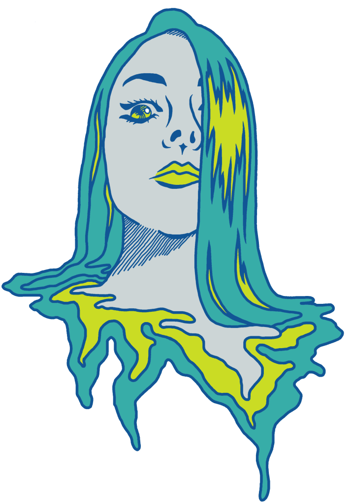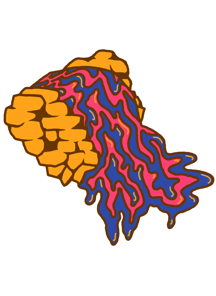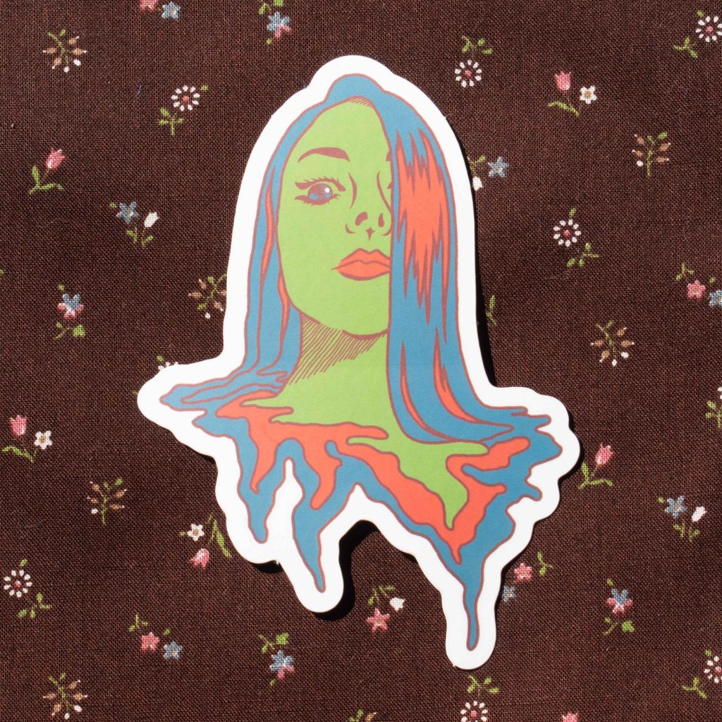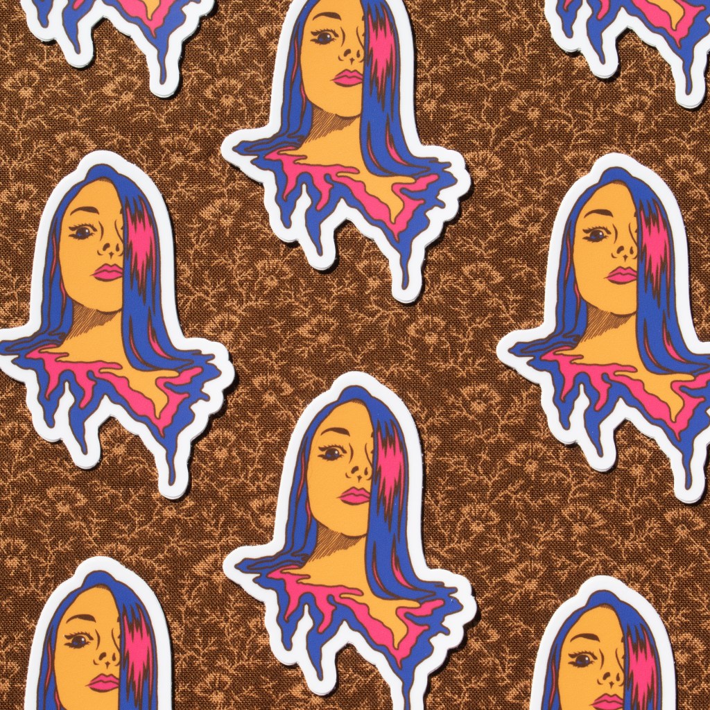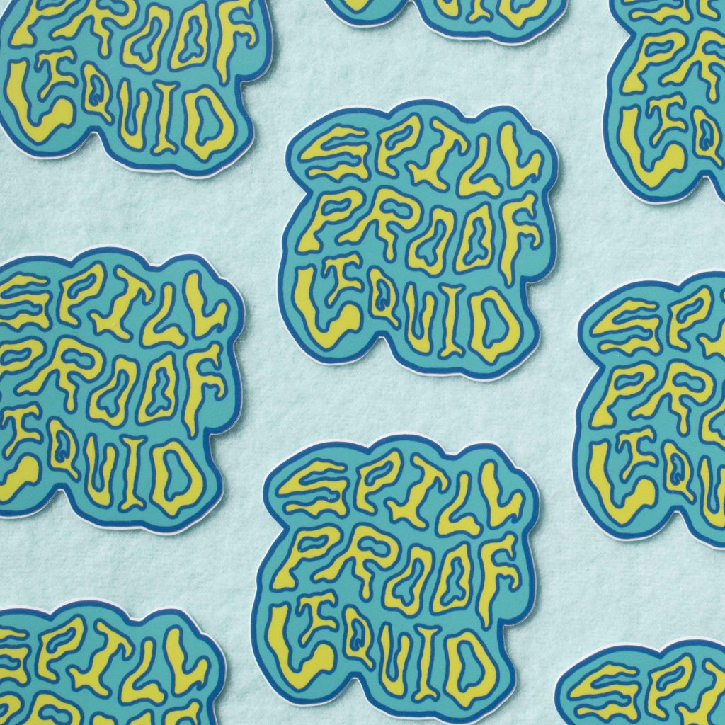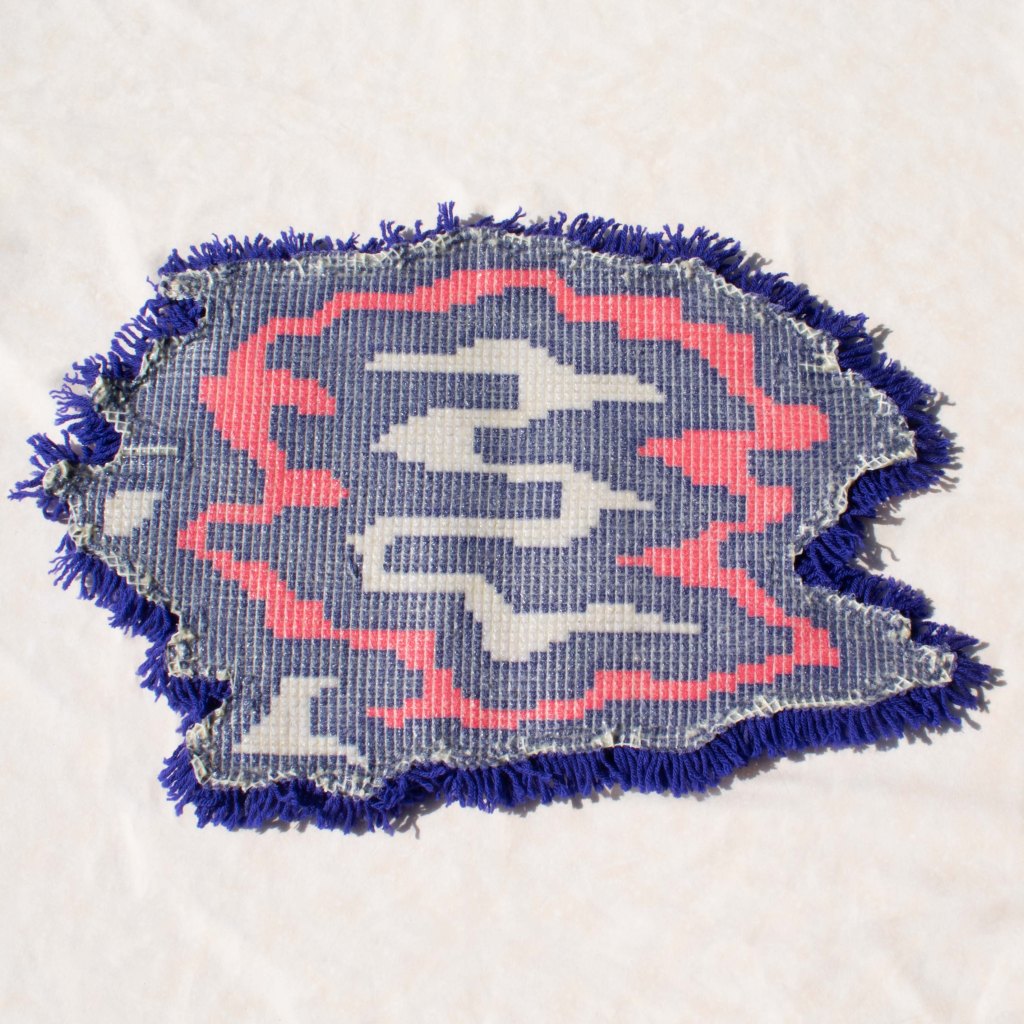 A body of handiwork called SpillProofLiquid. This stylistically repetitive hand work focuses on a drippy, slimy pattern in various color palettes. These designs are typically 3 to 4 colors with graphic linework and flat colors. They are inspired by Japanese style and anime (Jojo’s Bizarre Adventure specifically), psychedelic 70’s styles including shag carpeting, psychedelic designs and themes and concert posters, especially rock concerts. They are focused on craft-type art and handmade methods including sewing, DIY clothing/style/aesthetic, latch hook rugs, etc.